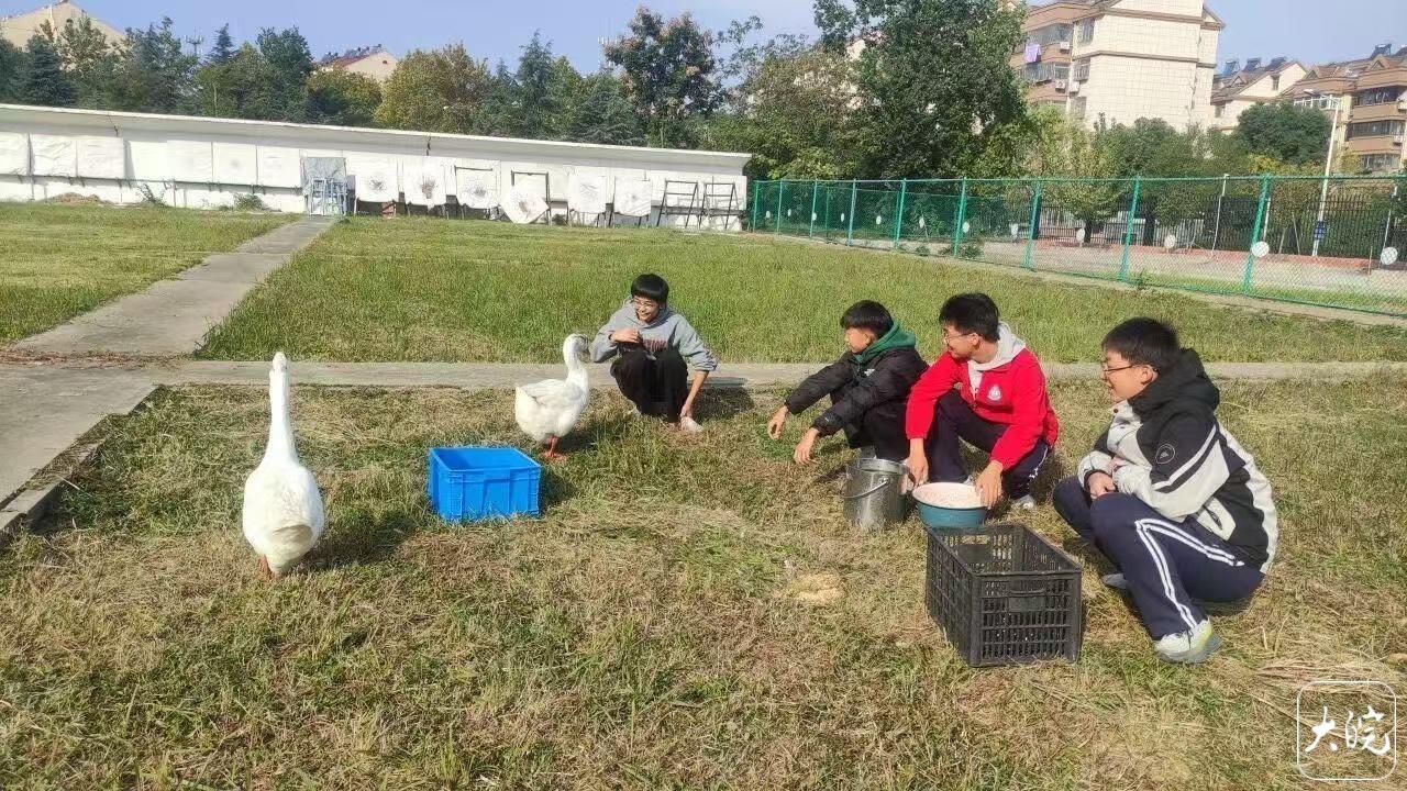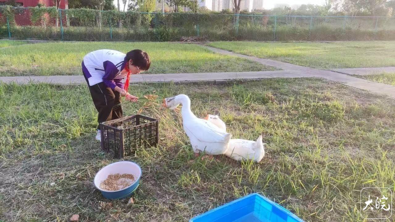 “我们去喂鹅吧”,下课铃响后,该校同学们多了些课间放松的方式。同学们来观看它们吃草、喝水,给它们喂食、打水,养殖小组的同学还给鹅舍定期清扫和消毒。“鹅鹅鹅,曲项向天歌,鹅的叫声经常在校园回荡,没想到小时候背诵的古诗,成了身边真实的画面,特别神奇。”周煜阳同学表示,现在他和很多同学都成了这两只白鹅的粉丝。周一扬同学说,“当我有小烦恼的时候,我就会去喂喂鹅,感觉心情都会放松很多。”在她看来,与鹅互动,能够缓解焦虑和压力,帮助自己以更健康的心态面对学习和生活中的挑战。