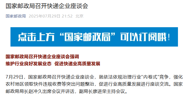 消息面上,7月29日,国家邮政局召开快递企业座谈会,就依法依规治理行业“内卷式”竞争,强化农村地区领取快件违规收费等突出问题整治,促进行业高质量发展进行座谈交流。中通、圆通、韵达、申通、极兔等快递企业相关负责人围绕会议主题进行交流并提出意见和建议。