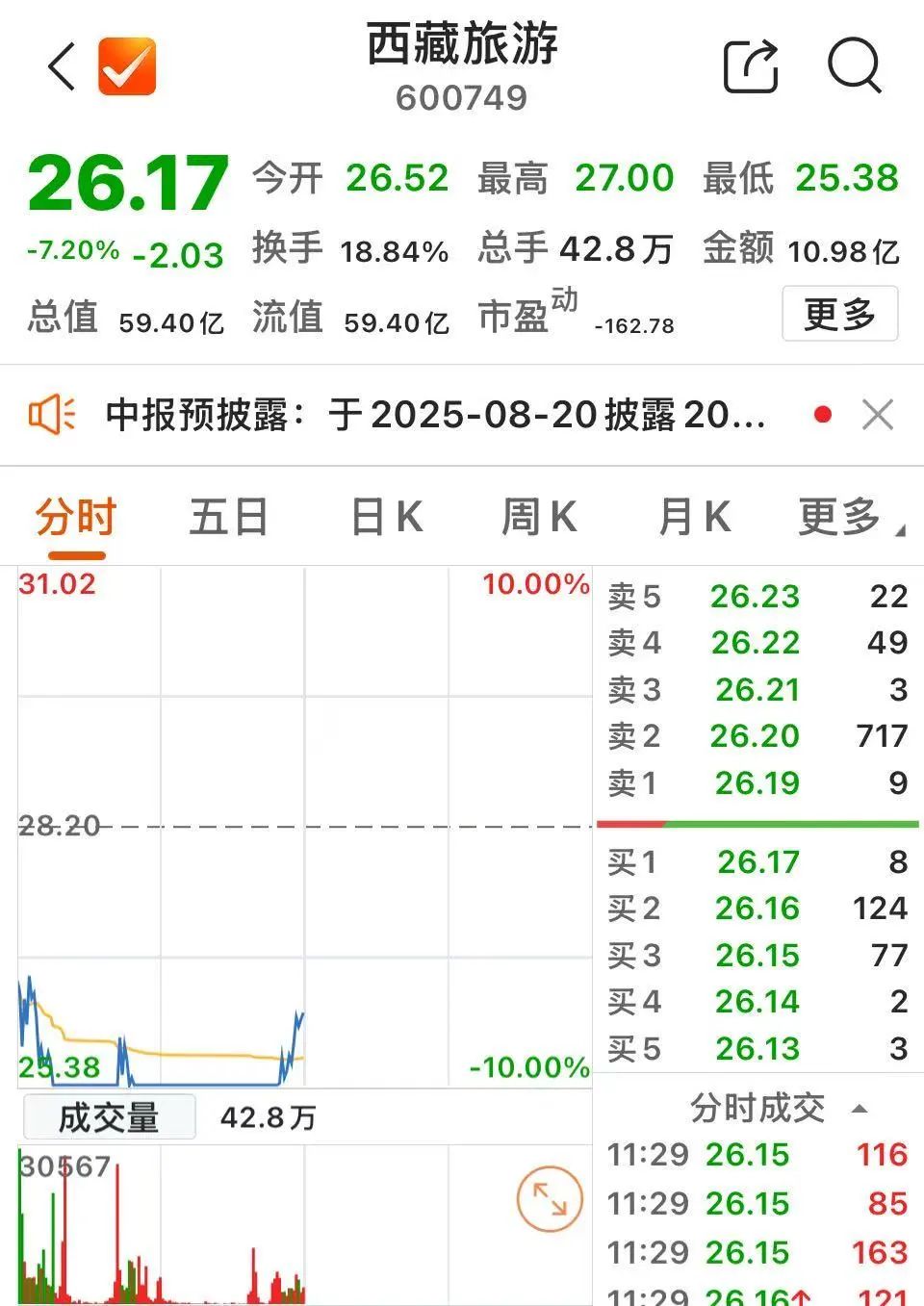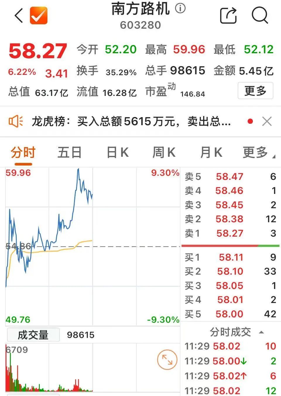今日早盘,上述两只个股走势迥异。西藏旅游大幅低开后股价多次触及跌停,截至午间收盘下跌7.20%,半日成交超过10亿元;南方路机同样大幅低开,但随后股价很快拉升翻红,盘中最大涨幅超过9%,截至午间收盘上涨6.22%,半日成交5.45亿元。