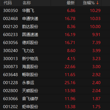 快递板块早盘表现活跃,申万物流指数半日上涨2.50%,申通快递、韵达股份涨停,华鹏飞(维权)涨超10%,圆通速递涨超9%,德邦股份涨超7%。