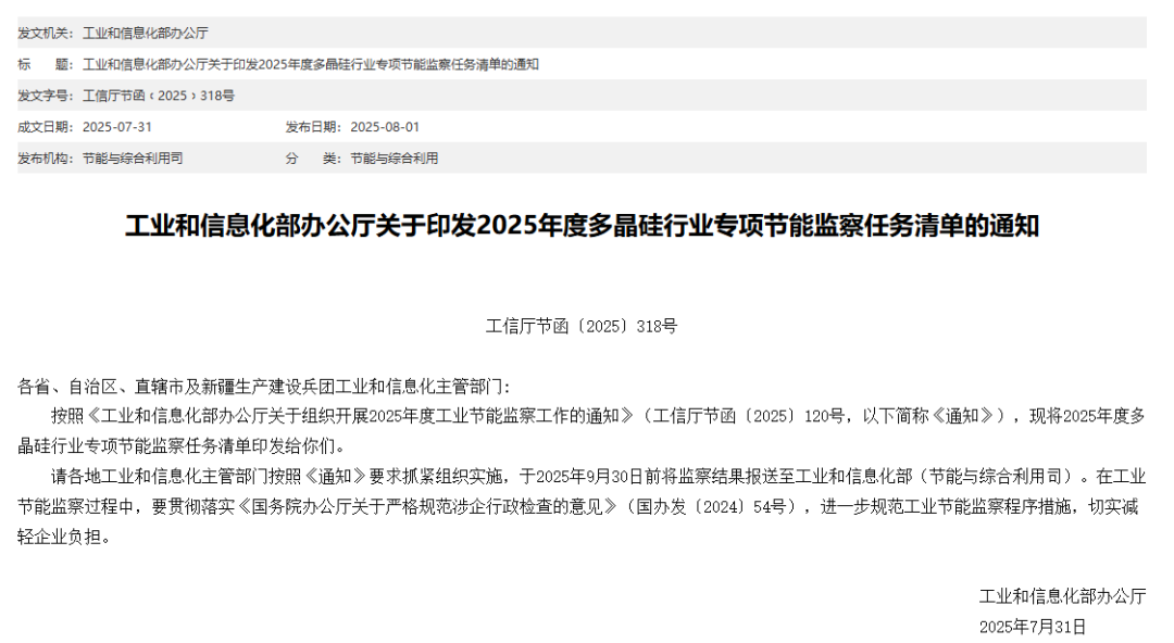 消息面上,工业和信息化部办公厅印发2025年度多晶硅行业专项节能监察任务清单,要求各地主管部门按照要求抓紧组织实施,于9月30日前将监察结果报送至工业和信息化部(节能与综合利用司)。
