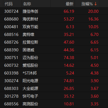 早盘,光伏设备、快递板块集体走强。申万光伏设备指数半日上涨2.75%,涨幅居所有行业首位,捷佳伟创收获20%幅度涨停,双良节能同样涨停,海优新材涨超16%,固德威、奥特维等跟涨。